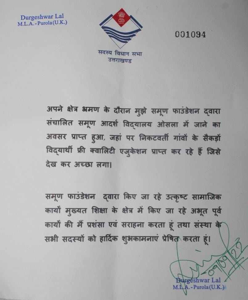 Appreciation Letter from DURGESHWAR LAL, M.L.A. - PUROLA (UTTARAKHAND)