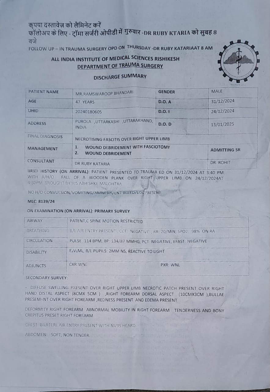 Ram Swaroop, a laborer from Rajat Khet Dharkot Dharmandal in Tehri Garhwal, came to Rishikesh looking for work to support himself. While working at a film shoot in Gita Bhawan, a heavy wooden beam fell on his arm, causing severe injuries. Sadly, after the accident, the contractor who hired him disappeared, leaving Ram Swaroop with no support or contact details.