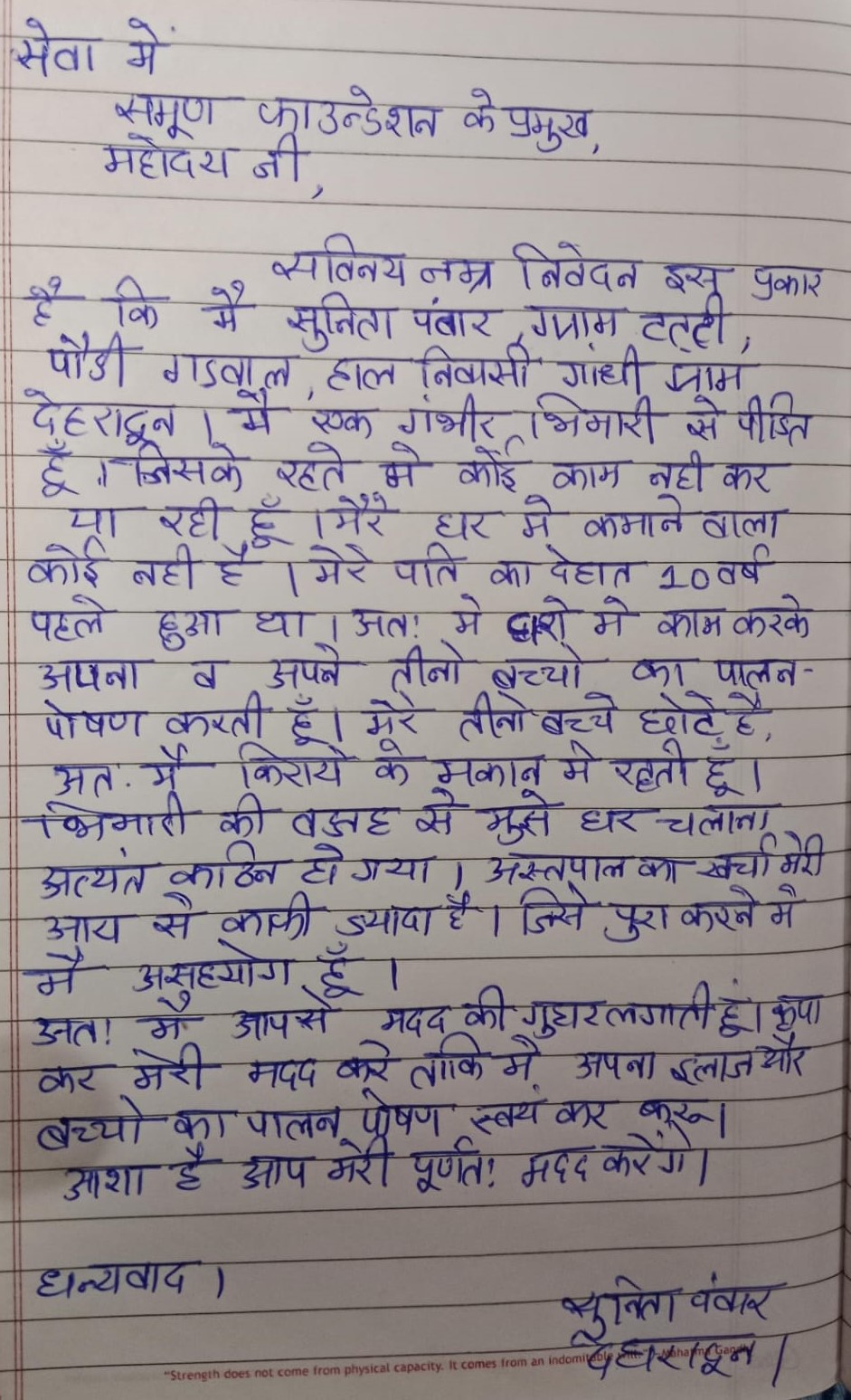 In this desperate time, Sunita has reached out through the Samoon Foundation, seeking help from anyone who can offer support. Her strength is undeniable, but she cannot face this fight alone.