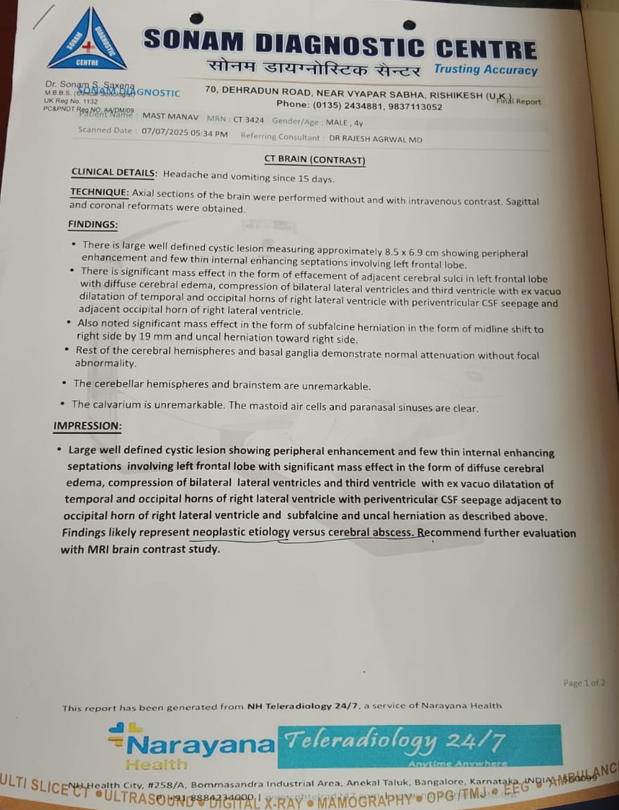 Just a few days ago, Manav’s health started to deteriorate unexpectedly. He complained of severe headaches and vomiting. His parents took him for a medical check-up, and what followed was a devastating diagnosis — a large brain tumor that is causing swelling and pressure on his brain. Doctors immediately recommended urgent treatment, including brain surgery, with an estimated cost of ₹7 lakh.